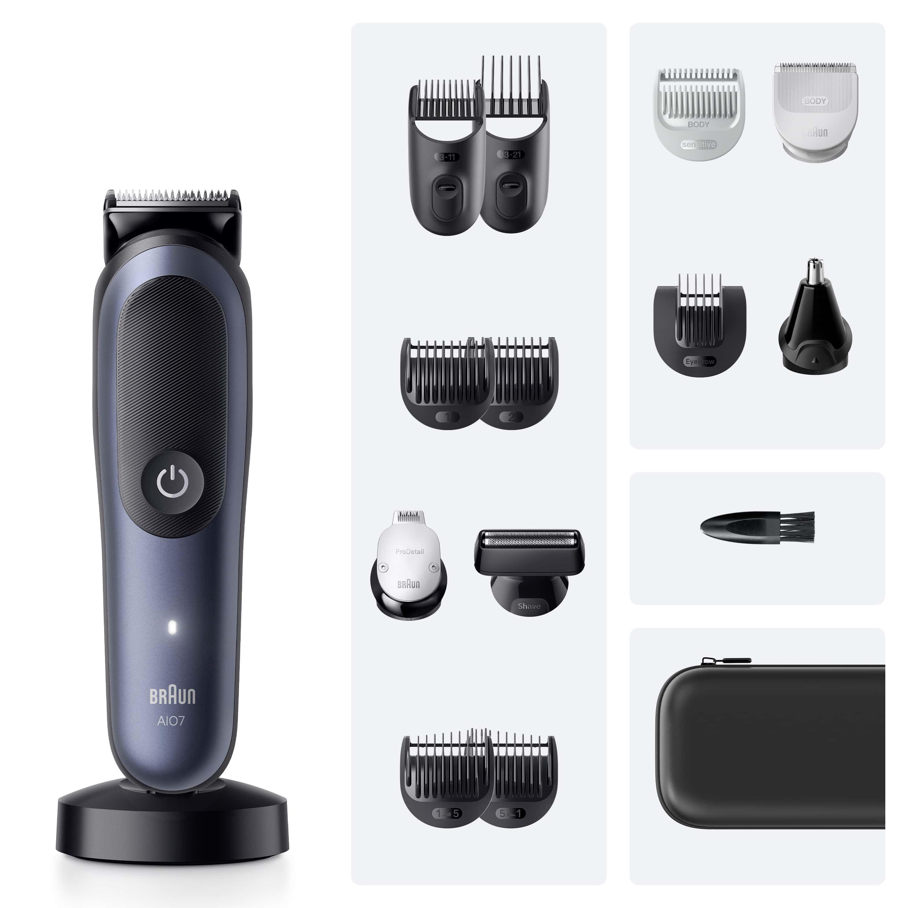 Kutu İçeriği: 3 - 11 /,13 - 21 mm aralıklı taraklar, 1 ve 2 mm’lik sabitleyici taraklar, 1-5mm / 5-1mm sakal kademelendirme tarakları, Vücut / Özel bölge kullanımı için özel başlık ve hassas tarak, Kulak ve burun kılı düzeltici, Gelişmiş folyo başlık, Kaş tarağı, Detail bıçağı, Saklama Kabı.