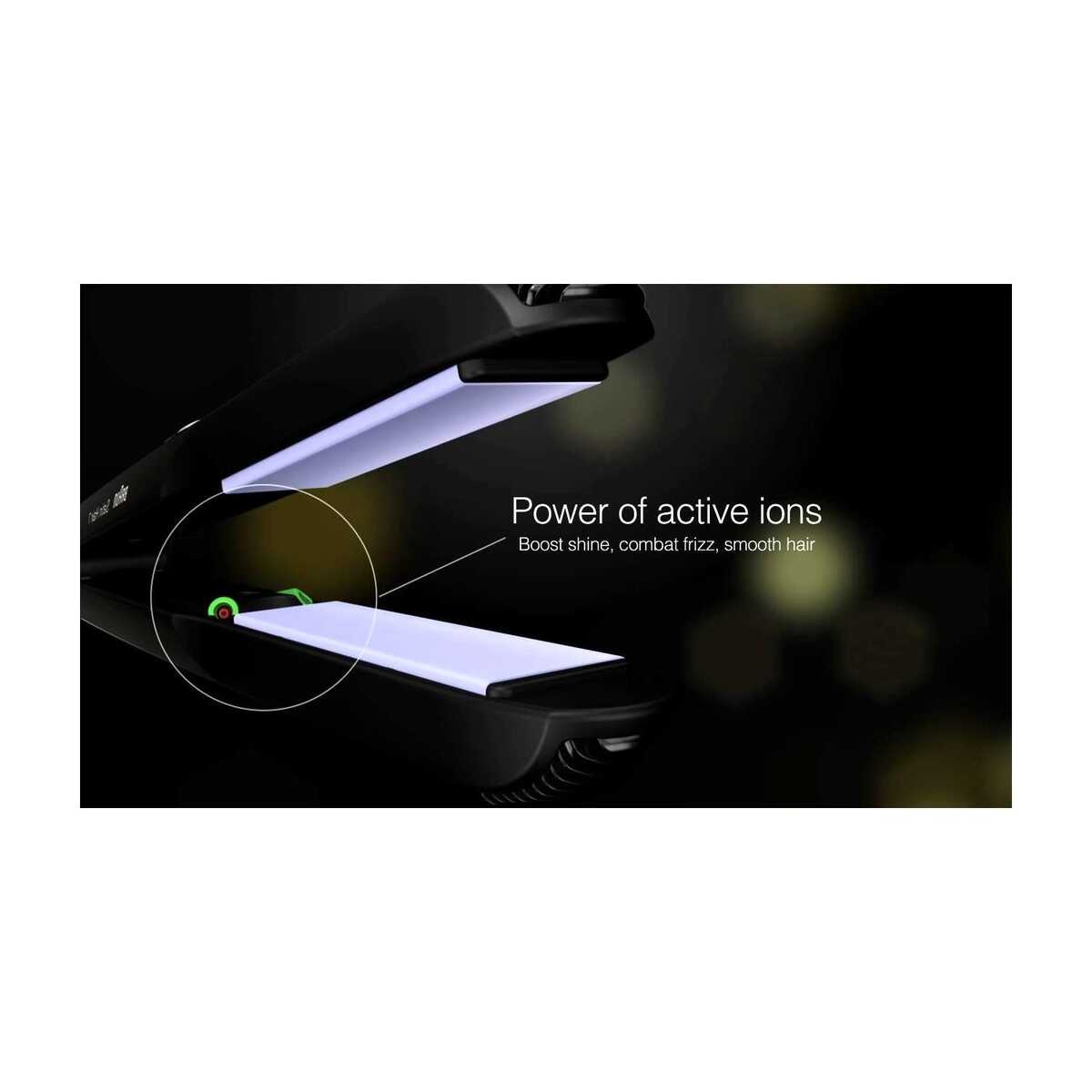 Braun Satin Hair 7 IONTEC saç düzleştirici geleneksel düzleştiriciler ile ortaya çıkabilen elektriklenme ile mücadele etmek için devrim niteliğindeki IONTEC teknolojisini kullanır. Bu teknolojinin sırrı tek bir düğmeye dokunduğunuzda yayılan milyonlarca aktif iyondur. Bu aktif iyonlar saç kremi görevi görerek, her saç telini kaplar ve aşırı yüksek sıcaklıkta saç şekillendirme nedeniyle kaybedilen nemi hızlıca geri kazandırır. Saçlar kabarmaz ve yenilenmiş bir pürüzsüzlük ve parlaklık kazanır.