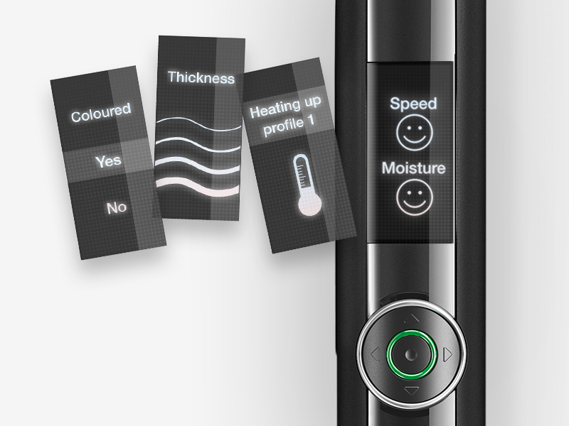 Her dokunuşta, ekranda saçınızın nem düzeyine dair geribildirim, sağlıklı biçimde düzleştirilemeyecek kadar ıslak olup olmadığı konusunda uyarı ve olası en iyi şekillendirme için dokunuşlarınızın hızı konusunda geribildirim sunulur.