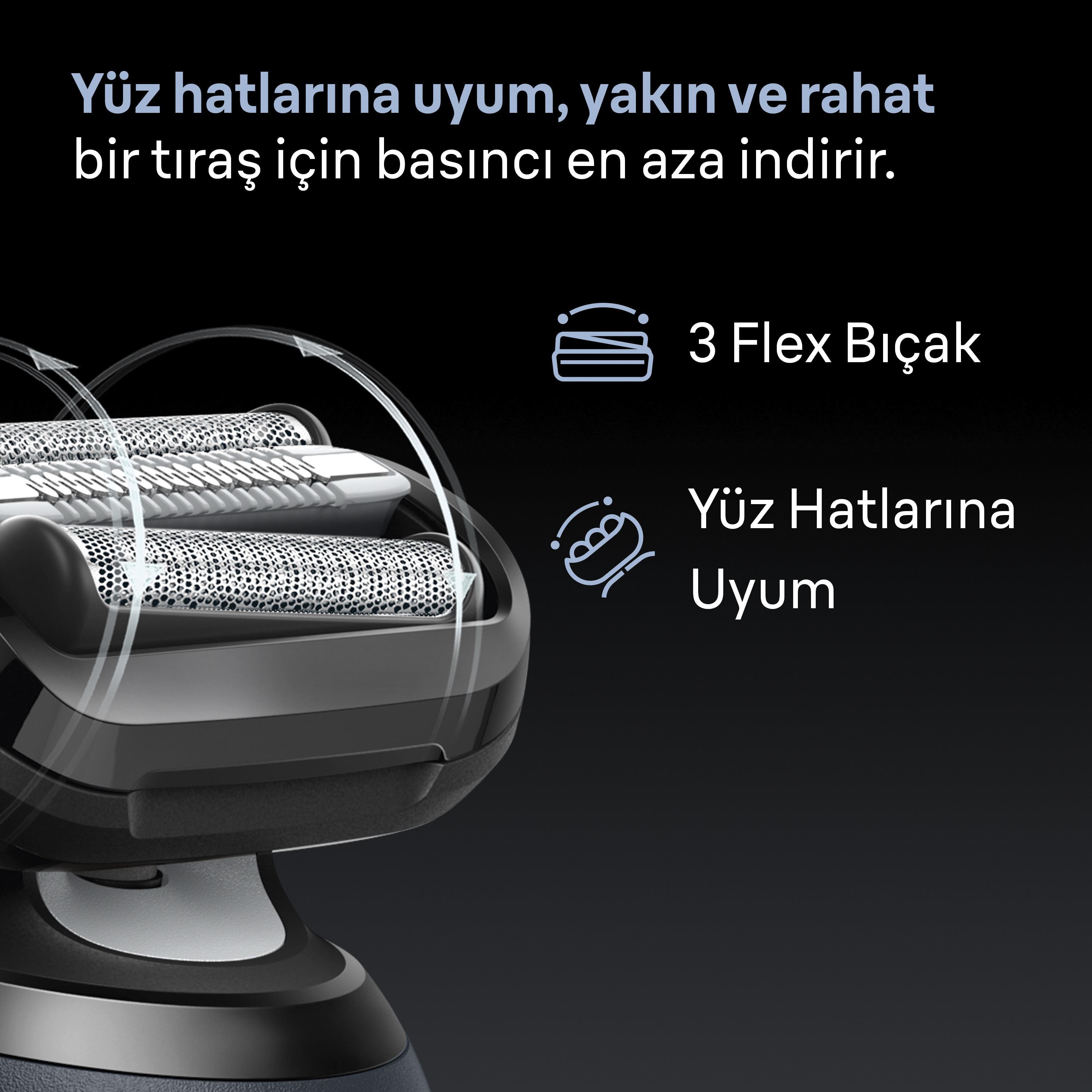 Cilt üzerinde hassas, yakın ve rahat bir tıraş için yüz hatlarınıza uyum sağlarken basıncı en aza indirir.2D Yüz Hatlarına Uyum 3 Flex Bıçak Hassas Cilt Koruyucu Hızlı ve nazik bir tıraş için.Turbo Modu Nazik mod |