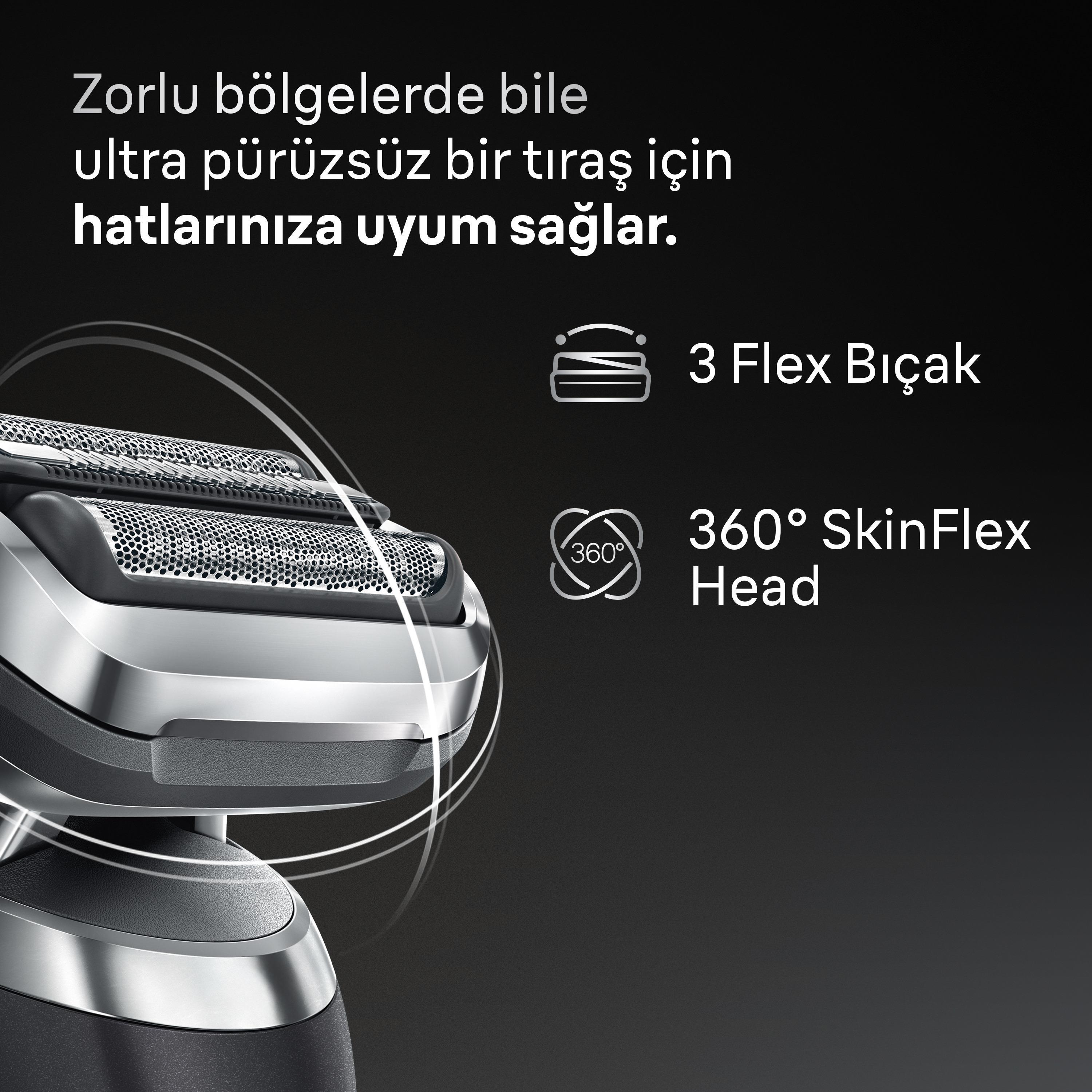 Ulaşılması zor alanlarda bile optimum cilt teması için yüz hatlarınıza uyum sağlar.360° SkinFlex başlık 3 Flex Bıçak 2x Yakınlık Folyosu 1 x Zor Tüyler için Merkez Düzeltici Tıraşınızı kişiselleştirin.Turbo Modu Nazik mod Standard Mod *Nazik Moda kıyasla |