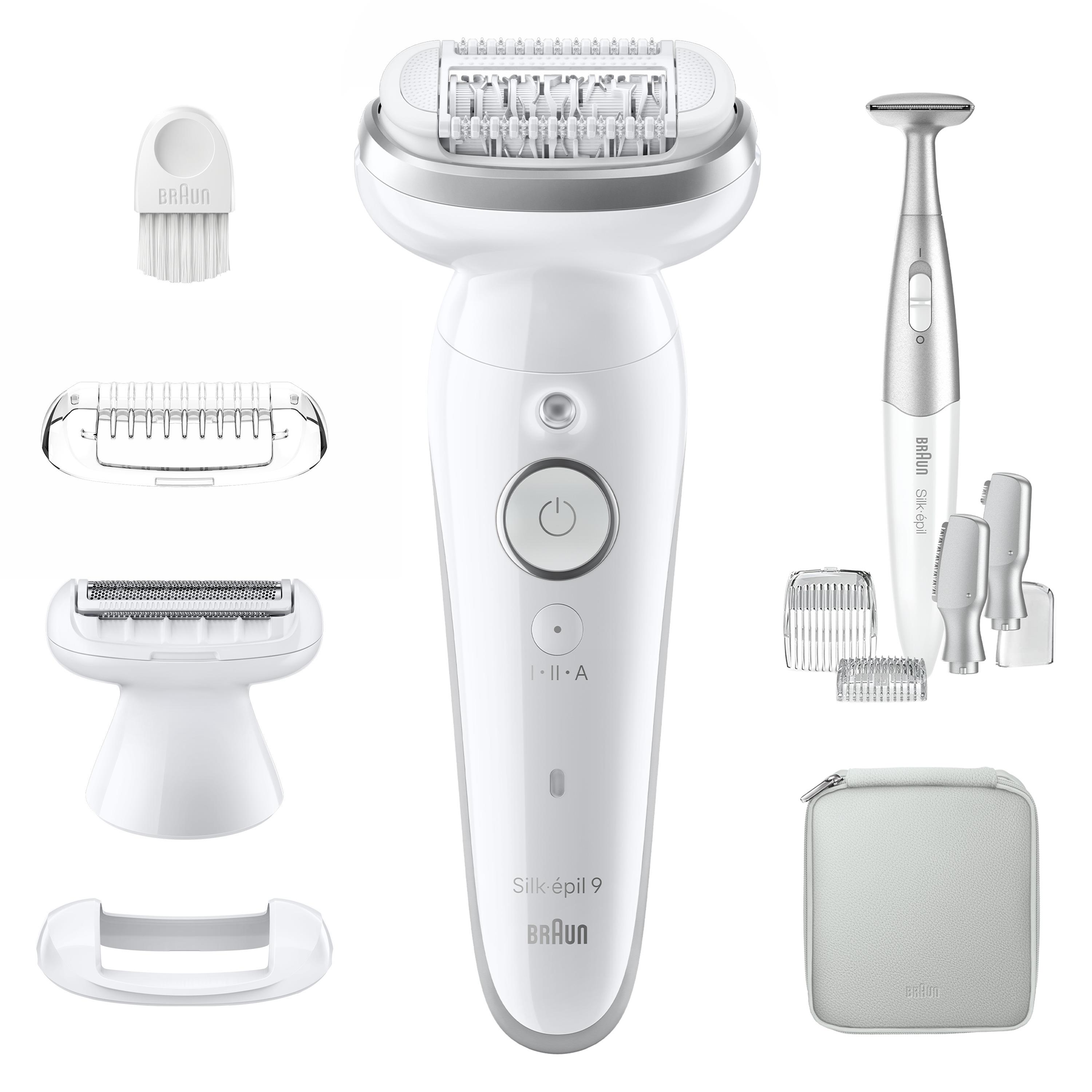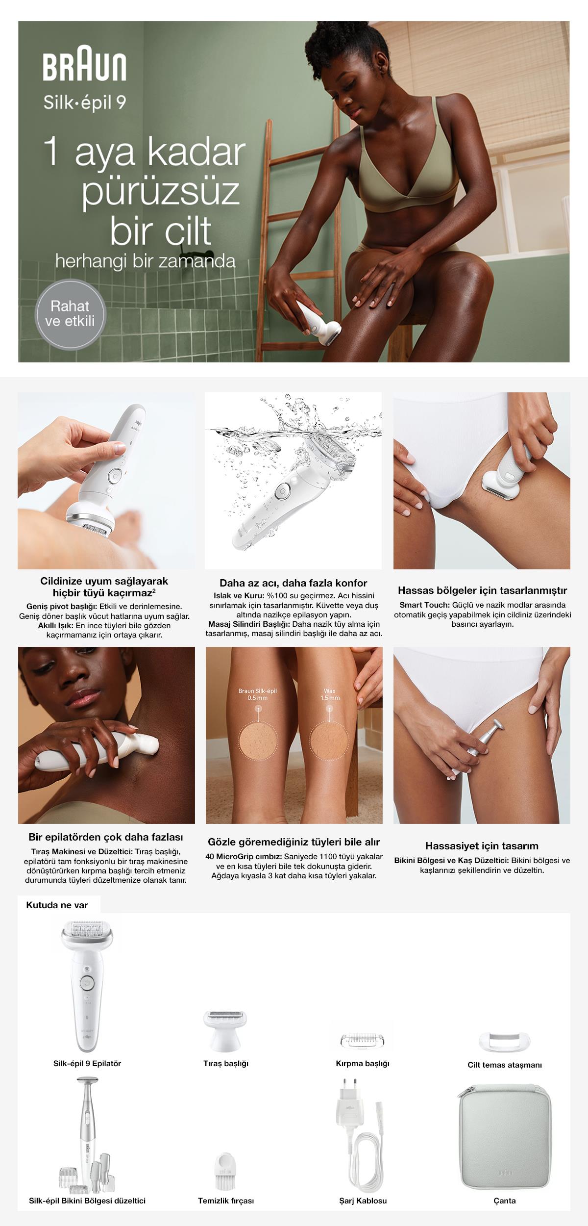 Kutu İçeriği: Cihaz, Tıraş Başlığı ve Tarağı, Cilt Temas Başlığı (‘Masaj Silindirli Başlık’ kullanılmak istenmiyor ise), Silk-epil Bikini ve Kaş bölgesi düzeltici, Çanta ve Temizlik Fırçası.