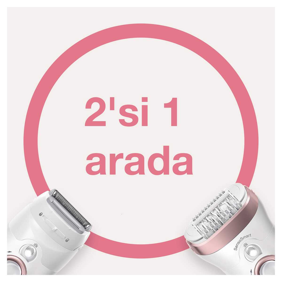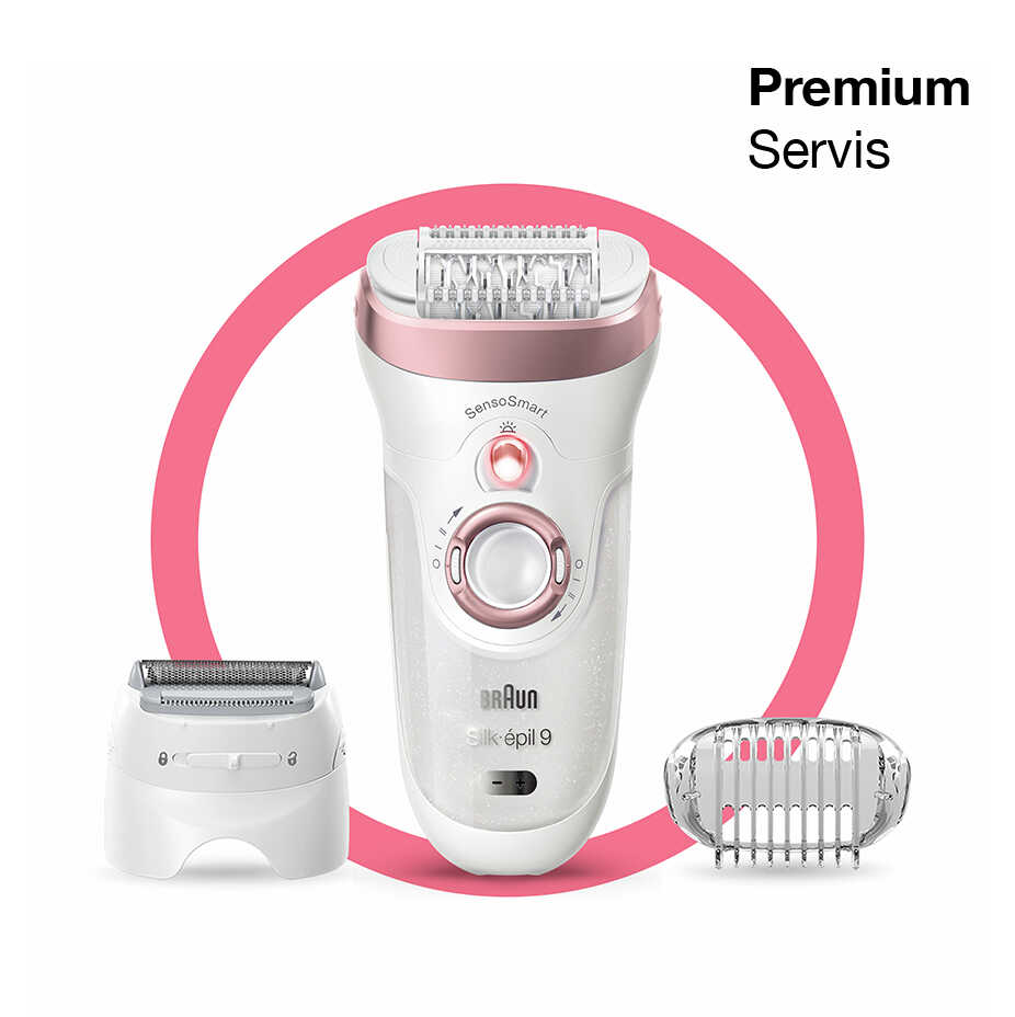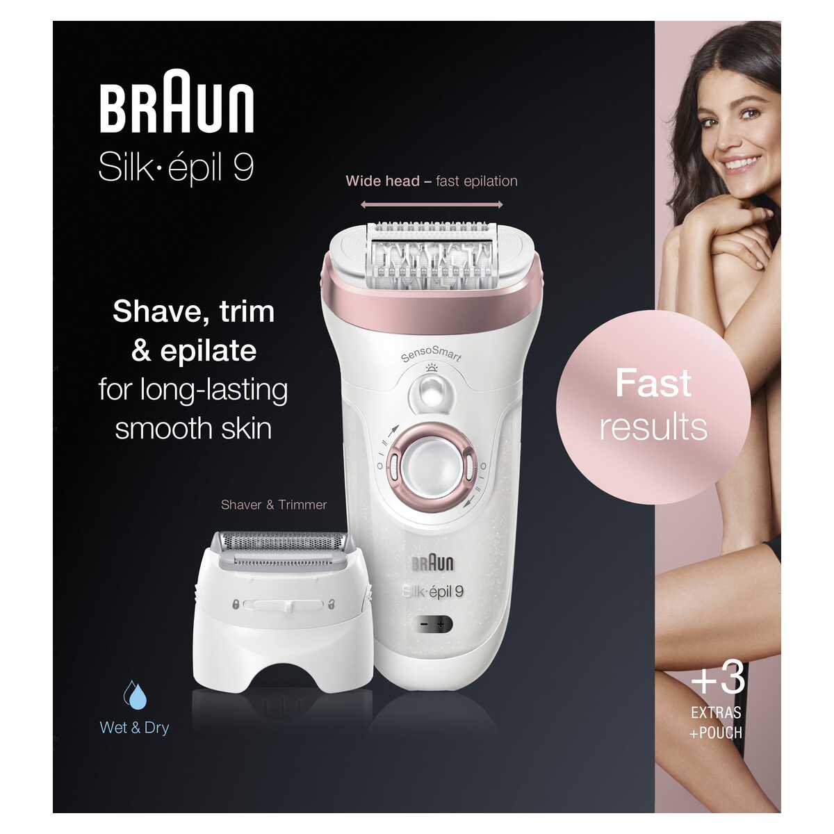 Silk-épil 9, daha hızlı epilasyon ve ultra hızlı sonuç için daha geniş bir başlığa sahiptir. Günler boyu değil haftalar boyu pürüzsüz cilt için tıraş eden, düzelten ve tüy alan ek parçalarla birlikte sunulur.