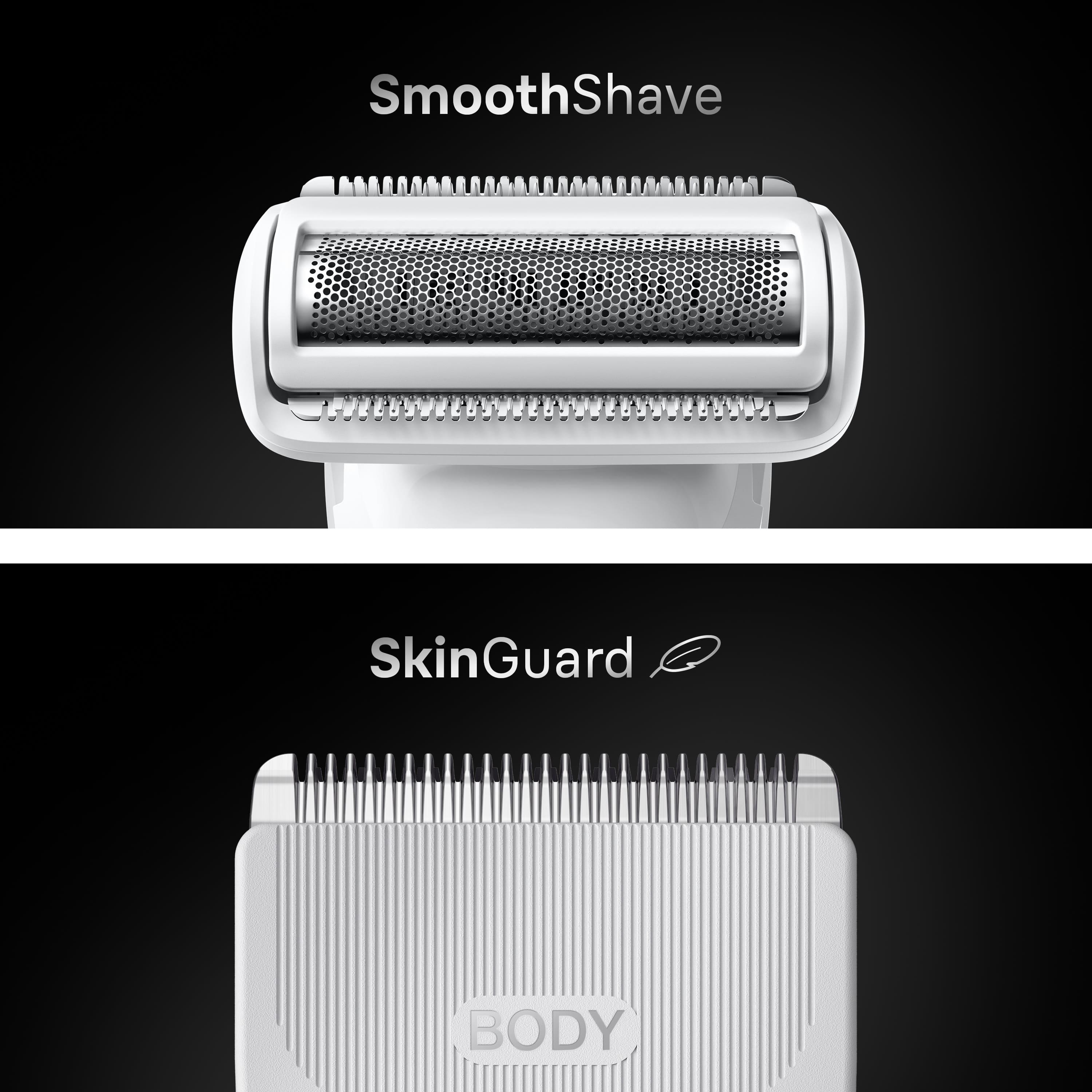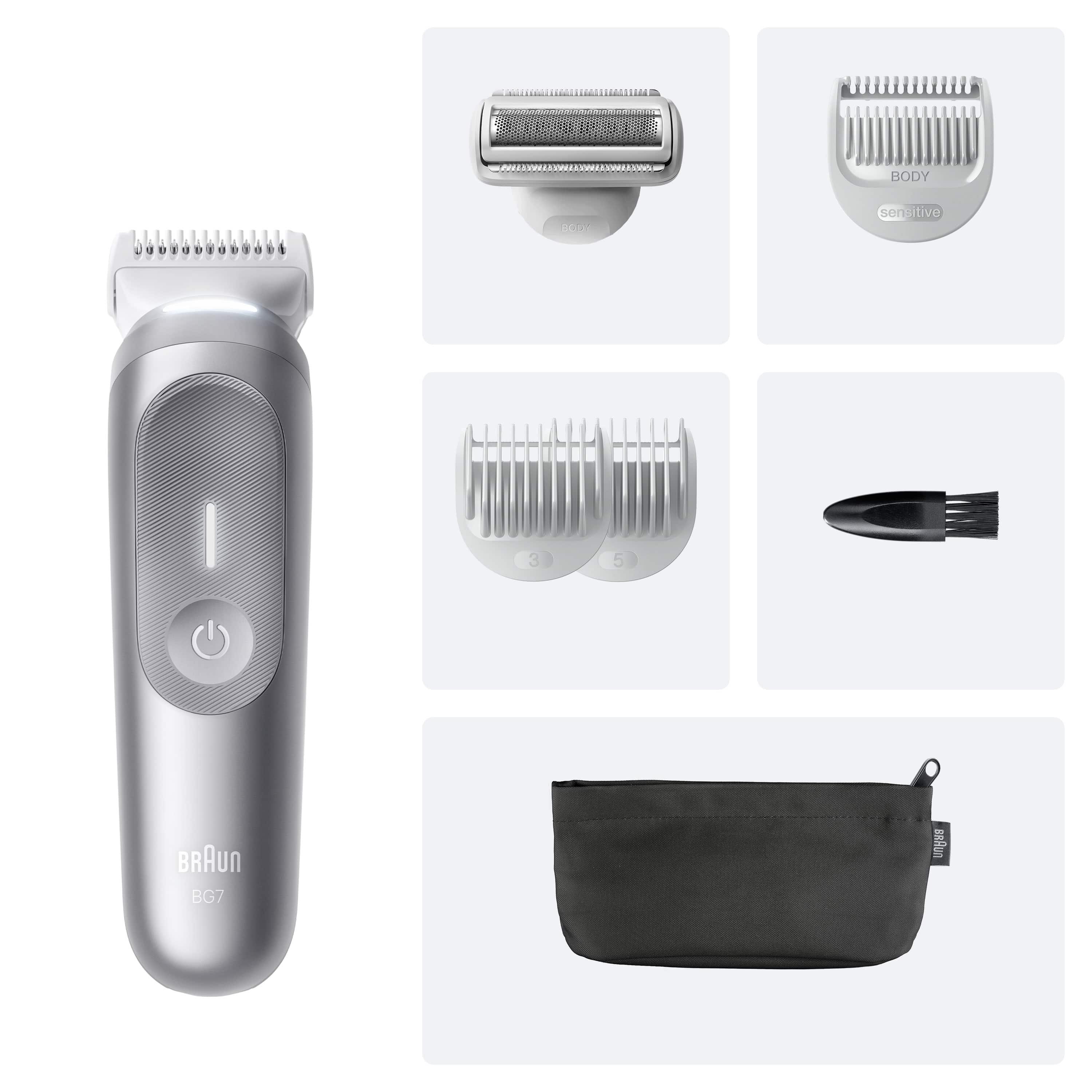 Kutu İçeriği: 3mm, 5mm ve 0,5mm Body Sensitive tarak, Pürüzsüz kesim başlığı, Fermuarlı kese saklama çantası ve Temizleme fırçası.
