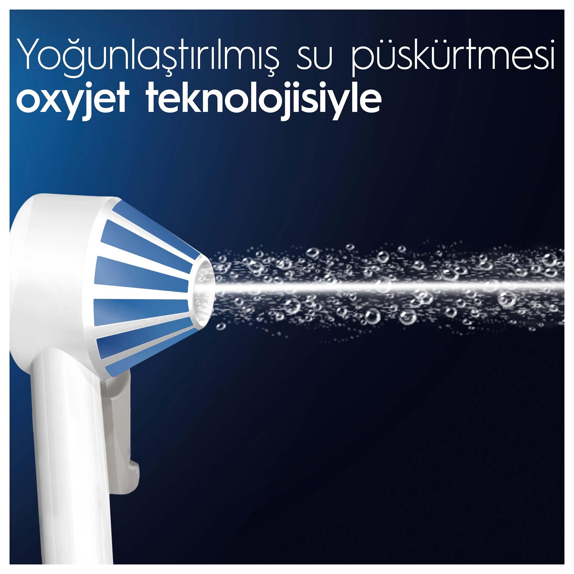 Oral-B'nin OxyJet Teknolojisi, suyu mikro hava kabarcıklarıyla zenginleştirir. Aynı zamanda su akışını hassas bir şekilde kontrol edebileceğiniz isteğe bağlı butonu ile ağız sağlığı rutininizi geliştirir.
